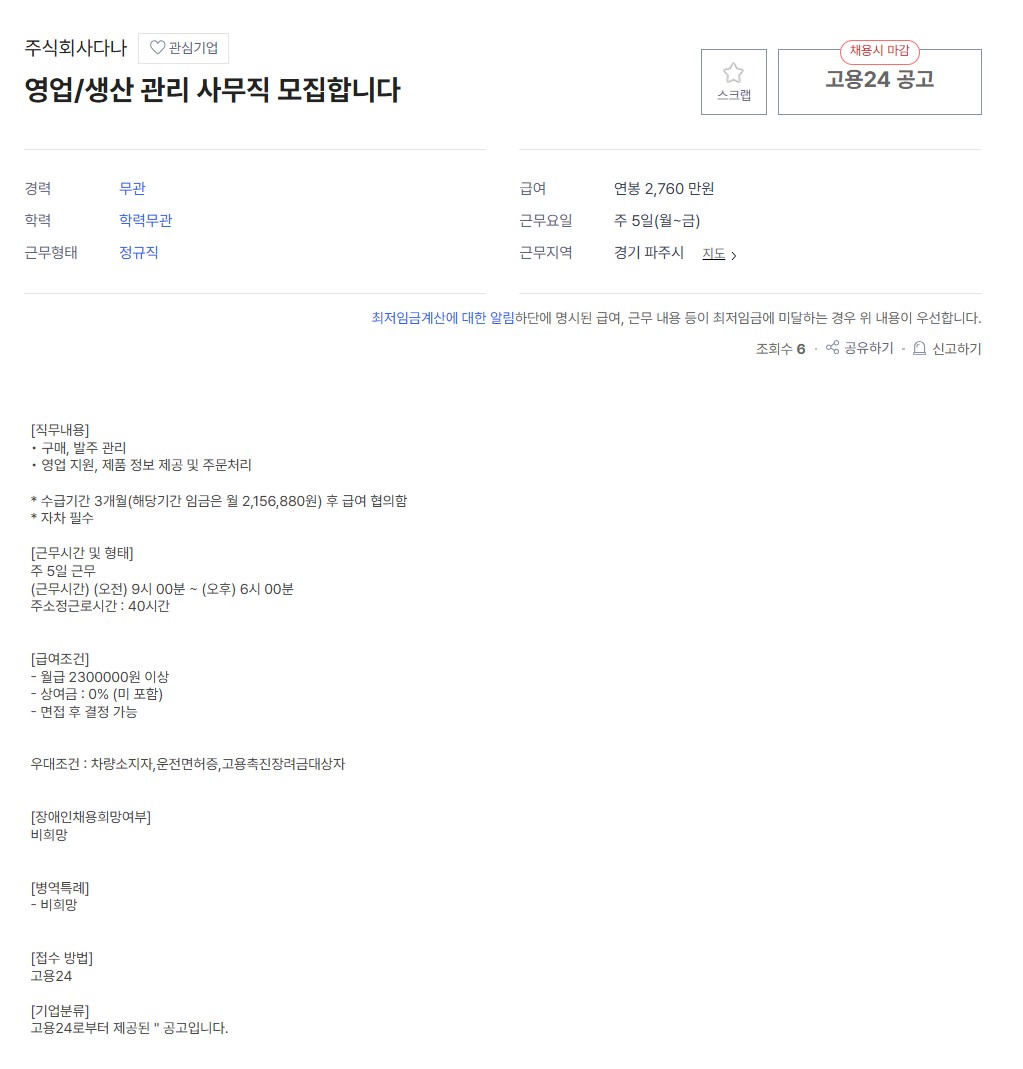 영업/생산 관리 사무직 모집합니다